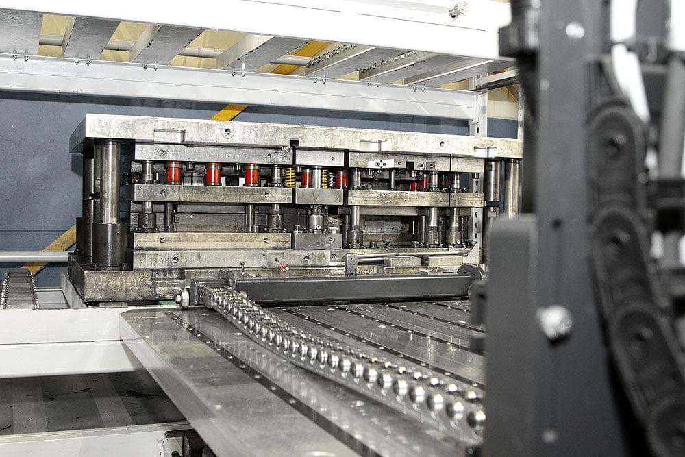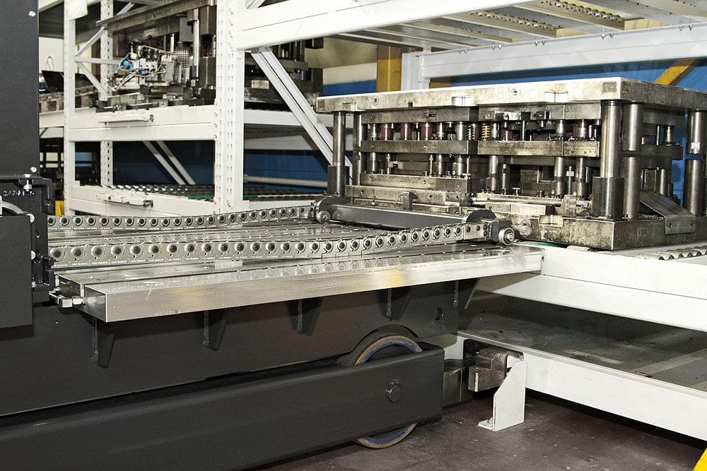 Consistently high productivity is made possible by individual complete systems for efficient die change. A new feature is a pull-push system that moves dies weighing up to 50 t in and out of the press via a chain drive. It is screwed directly to the press bed, where the chain transports the die at a speed of 33 mm/s. Faster versions with a maximum of 200 mm/s are also available. A separate guide is usually not required. The system is supplied without control as standard; the control is available as an option.