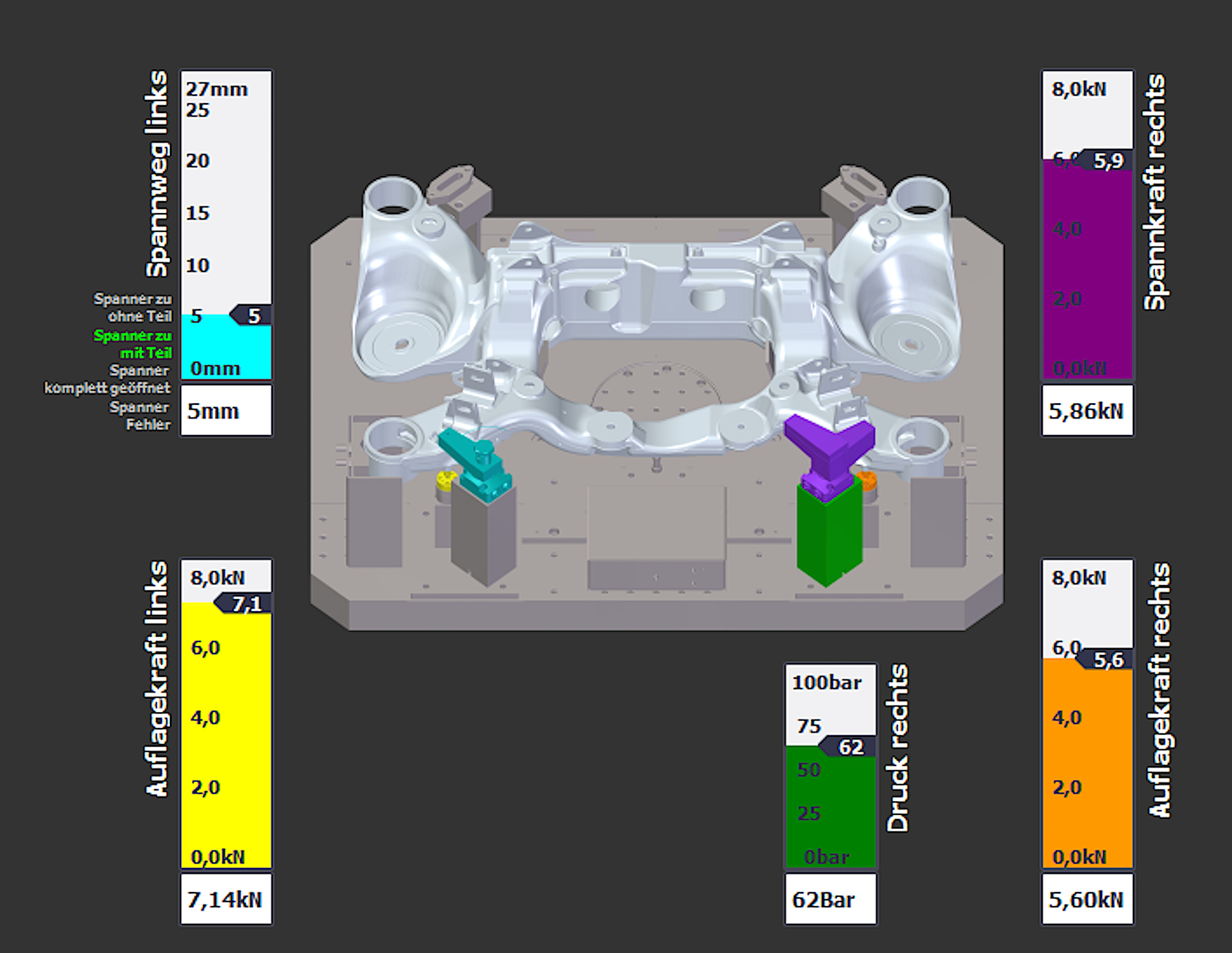 In the innovation, various clamping elements take over the monitoring of the component clamped on the fixture. In the pilot project, for example, only two modified hydraulic standard swivel clamps equipped with sensors, one pressure sensor and two contact sensors are required for a cast aluminium rear axle frame. Through the correct arrangement of the elements and the transverse interrogation of the sensors, two electrified clamping points are sufficient to be able to make reliable statements: