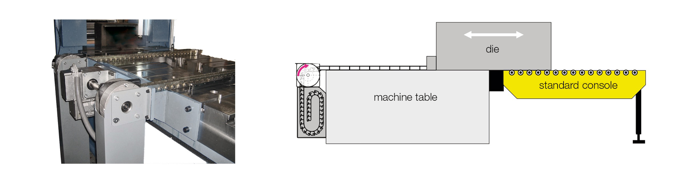 その後、金型はフォークリフトまたはクレーンでコンソール上に設置されます。内蔵のプッシュチェーン駆動装置が、内蔵のローラーとボールバーを介して金型をプレス機の最終位置まで移動させ、固定ストッパーに対してもミリ単位の精度で位置決めを行います。
