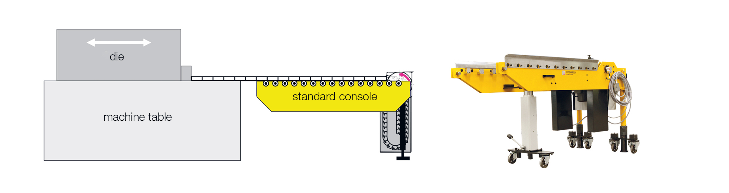 コンソールは、プッシュチェーン駆動による電気モーター駆動式で、特にコンパクトな設計となっており、低いプレスベッドやアクセスが困難な環境でも簡単に使用できます。 異なるプレス機に交互に設置でき、部分的にまたは完全に自動化されたプロセスにも簡単に統合できます。