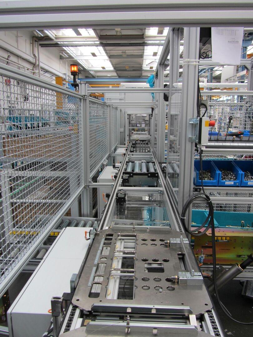 “For this line, we divided the assembly work into three steps and designed the corresponding manual workstations,” remembers Petra Stielow. First, the basic components of the support plate, pole plate and the poles are assembled, the pole plate is fixed by hand on the side of a stop. “This prevents it from slipping and at the same time the subassembly is optimally positioned at the centre of gravity,” emphasises the designer.